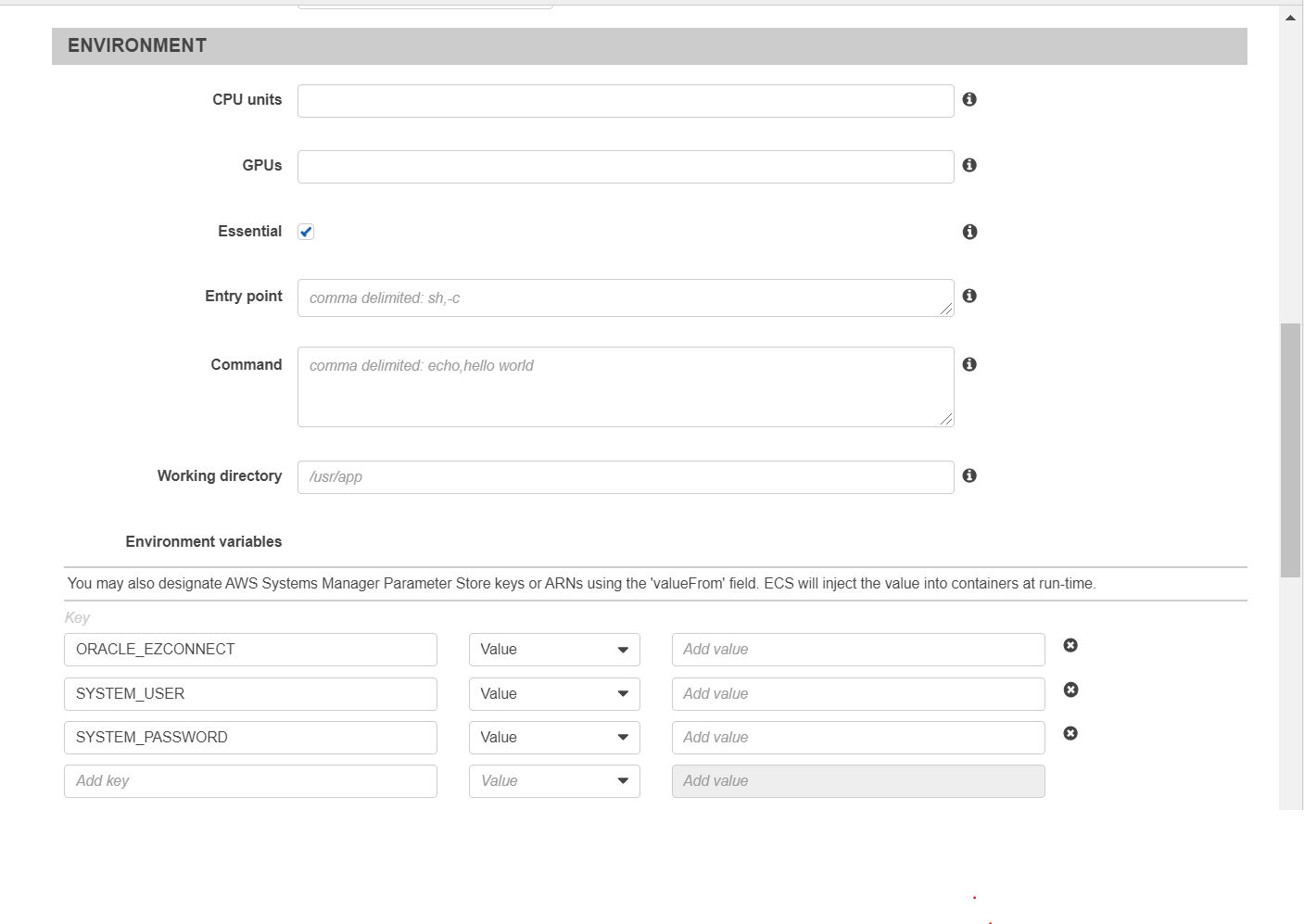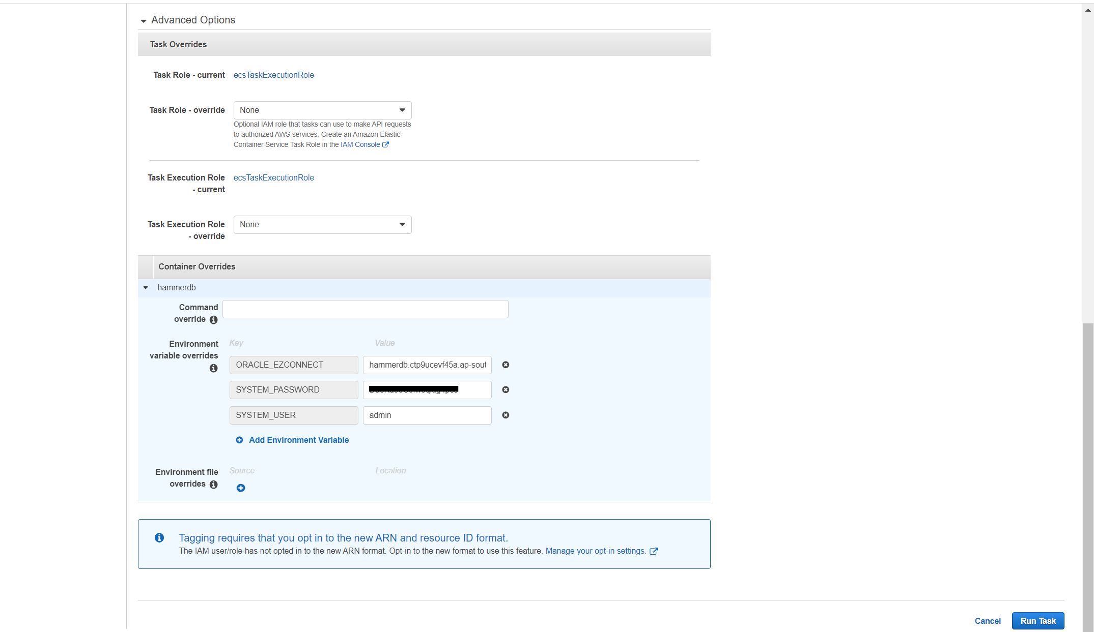 In the environment variables override, set the Oracle RDS connection string, system username and password.