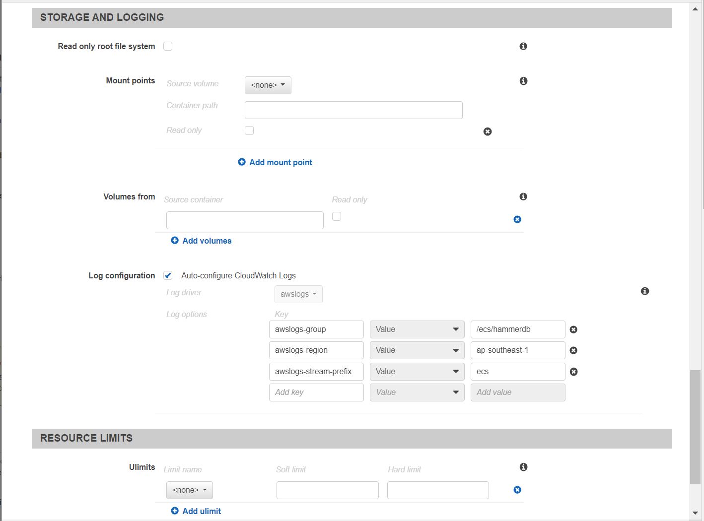Add the awslog configuration, so that we could view the log in CloudWatch.