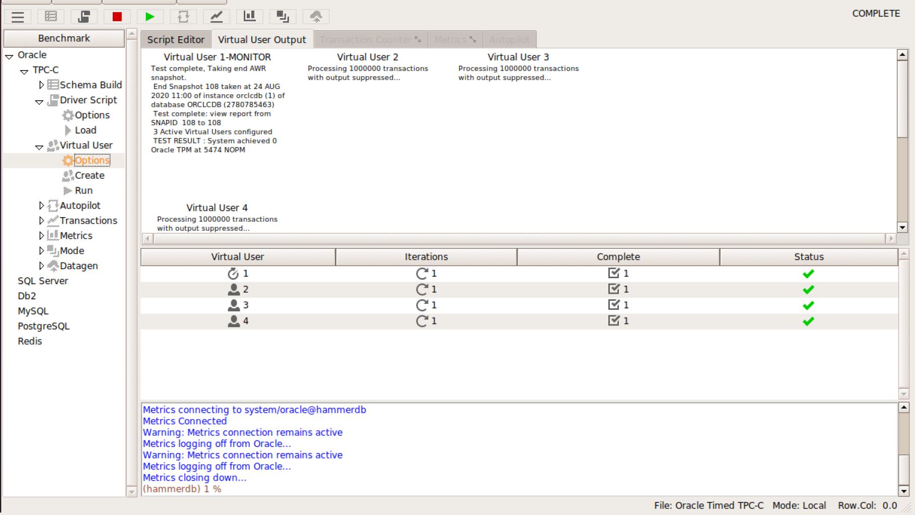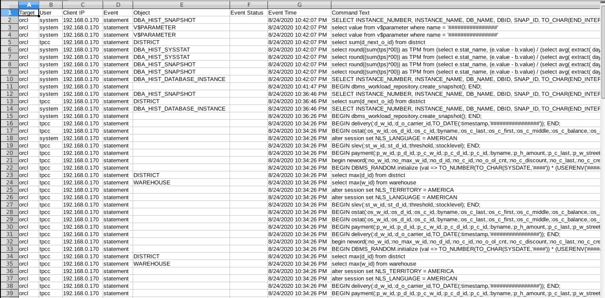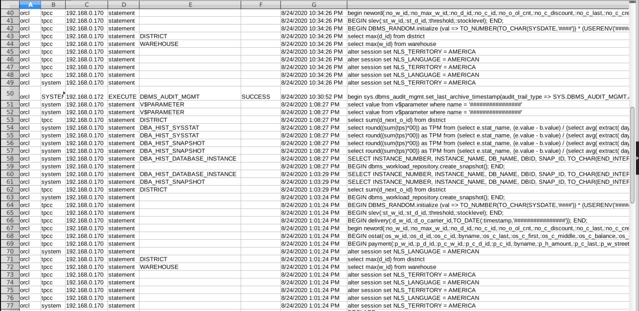 We exported the result to an csv file, it was quite clear that 3 set of same SQL statements were executed by 3 virtual users. Originally, I don’t expect this result, I were expected an result like database audit which would log millions of SQL for the hammerDB performance test.